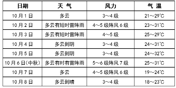 2.10月6日风力偏大,注意提前做好防风准备。7日起气温明显下降,提醒及时添衣。