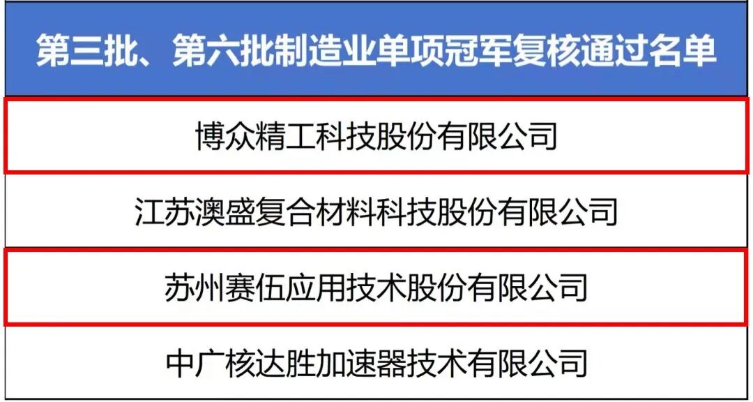 在公示的第三批、第六批制造业单项冠军复核名单中,博众精工科技股份有限公司、苏州赛伍应用技术股份有限公司也成功通过复核。截至目前,吴江区累计培育单项冠军企业15家,吴江开发区5家。