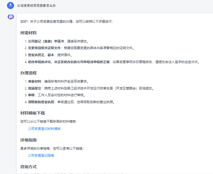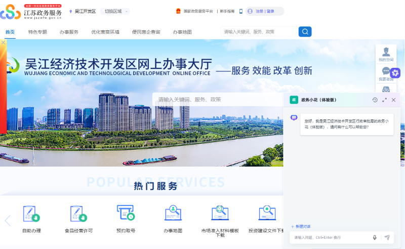 企业群众方面,“政务小花”实现7×24小时在线服务,可以通过江苏省政务服务网吴江开发区首页、吴江开发区微信公众号网上办事大厅使用智能AI机器人“政务小花”服务,足不出户对业务办理、政策信息查询等业务进行咨询,系统将高质量提供及时、准确的信息服务。工作人员方面,可通过智能检索获取政策法规、办事流程等信息,提升工作效率。