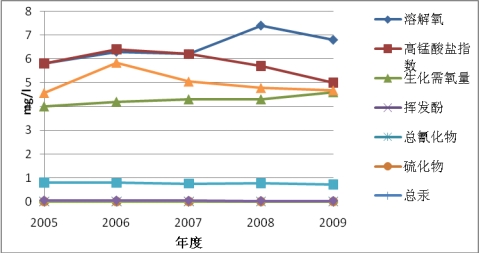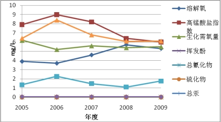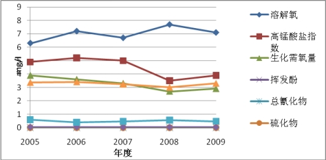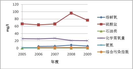 2006年和2007年间,运河吴江段主要污染指标为氨氮、高锰酸盐指数、生化需氧量、挥发酚和溶解氧。2008年以后挥发酚和溶解氧年均值达到《地表水环境质量标准》(GB3838-2002)Ⅲ类标准。2009年,运河吴江段水质年平均值除氨氮、高锰酸盐指数、生化需氧量超标外其余各指标均达国家地表水Ⅲ类标准。2006年和2007年间頔塘河主要污染指标为生化需氧量和挥发酚。2008年以后挥发酚和高锰酸盐指数年均值达到国家地表水Ⅲ类标准。2009年,頔塘河水质除生化需氧量超标外其余各指标均达国家地表水Ⅲ类标准。2006至2008年间,太浦河综合污染指数呈下降趋势,水质呈好转趋势;在2008年至2009年间,太浦河综合污染指数开始反弹,呈上升趋势,水质变差。其主要污染指标为生化需氧量、高锰酸盐指数、总汞和氨氮。2006至2009年间,松陵城河综合污染指数呈下降趋势,水质呈好转趋势。其主要污染指标是硫酸盐,其水质各指标均达国家地表水Ⅳ类标准(图2.1-2~5)。