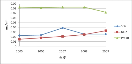 图2.1-1 吴江市区2006年至2009年年际空气主要污染物变化趋势图