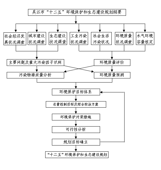 规划将在对吴江市城乡环境、社会经济发展状况调查的基础上,开展环境质量评价,认真分析当前存在的主要问题,客观核定环境容量,科学、合理地建立吴江市“十二五”环境目标体系,通过落实对策措施和工程项目,最终确定规划要求。规划编制技术路线如图1.5-1: