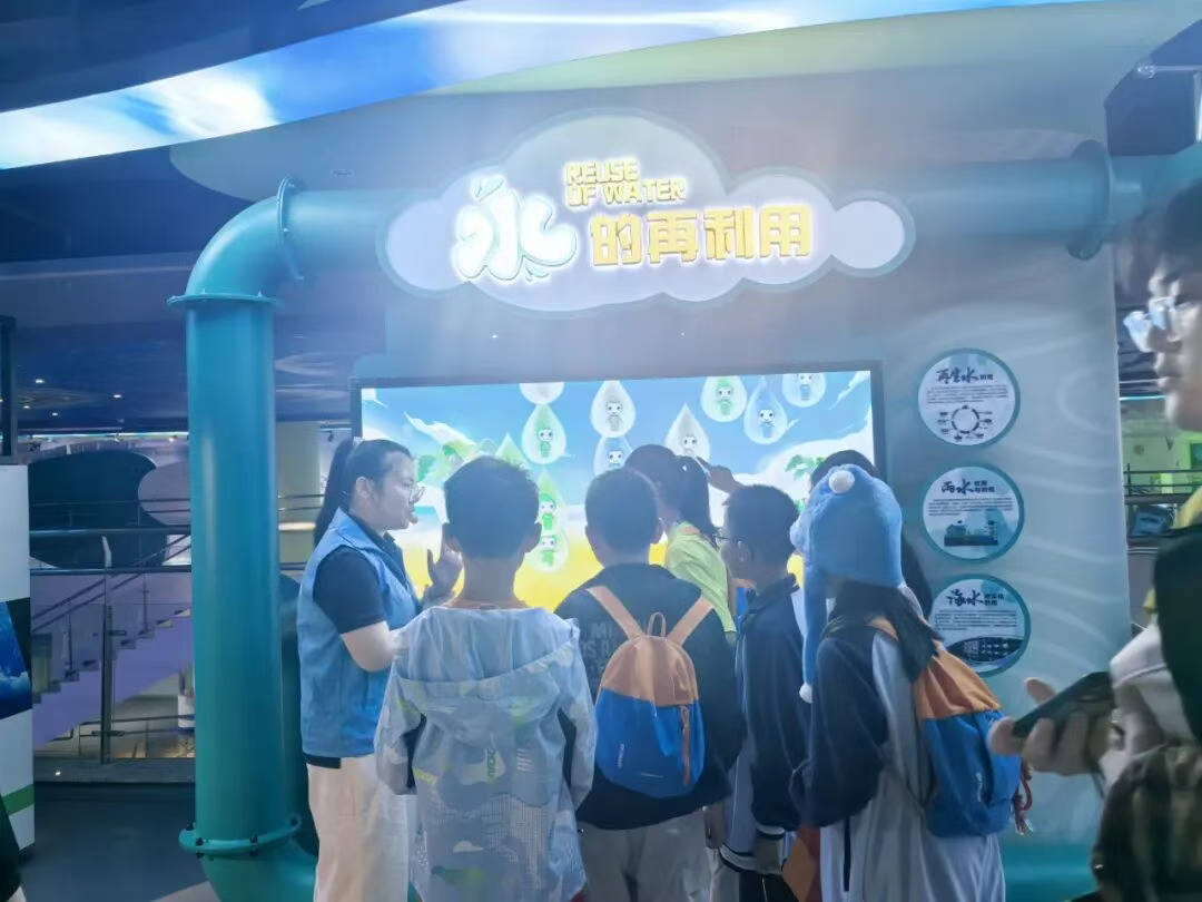 随后,小朋友们走进了吴江区节水教育基地。在这里,节水知识被巧妙“解码”。展厅的图文展板从远方拉到身边,为孩子们搭建起理解水情的阶梯;讲解并未停留于单向讲述,而是化身为一场场头脑风暴,一个个贴近生活的“为什么”,让抽象的数据瞬间与现实连接;馆内丰富的趣味科技互动装置,如触摸屏、模型演示、互动游戏等,让抽象的节水概念化为直观、可感的体验,节水的重要性进一步内化于心。